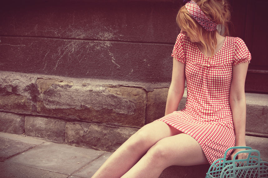 Wszystkie rzeczy które mam na sobie mają już po kilka lat (no oczywiście oprócz HaeMowego koszyka). Sukienkę wygrzebałam w jednym z ulubionych lumpeksów. Wzór kojarzy mi się nieco z ceratą, ale była tak urocza, że nie mogłam się wprost oprzeć. Podobnie było z chustą i balerinami. Te drugie przyznaję, długo leżały jeszcze w domu zanim zdążyłam się do nich przekonać. W momencie gdy Mamun powiedział, że je sobie zabiera skoro ja w nich nie chodzę, obudził się we mnie mały egoista, wzięłam je pod pachę i już nie oddałam. Poza tym są PRZEwygodne.