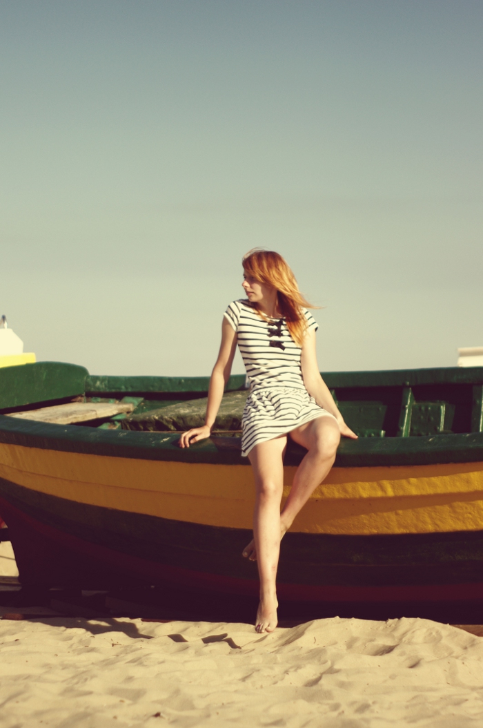 Powoli zbliżamy się do końca wakacyjnych wspomnień. Dziś jeszcze kilka marynarskich obrazów, bo jakżesz to tak jechać nad morze i nie poczuć się jak bosman? Zdjęcia robione były w kilku miejscach i pochodzą z kilku cudownie gorących dni, podczas których siłą nie szło nas ściągnąć z plaży czy ulubionego mola w Brzeźnie. Kiecka sprawdzała się idealnie bo wygodna, przewiewna i iście nadmorska (ba, wyeksploatowałam ją do tego stopnia, że wróciła cała zababrana kurczakiem z Asia Hung. Och tamtejsza chińszczyzno jak ja za tobą tęsknię!). Genialnie dawała radę w piasku, w Bałtyku i na pokładzie zielonej łajby. Generalnie jakby mi dali do łapy sieć rybacką, tudzież na oko nałożyli przepaskę, mogłabym spokojnie zostać wilkiem morskim i skrzeczeć gniewnie na leniwych majtków. Myślę, że w tej roli sprawdziłabym się doskonale i może to jest właśnie ta życiowa droga którą powinnam iść (no co?! Od zawsze wiedziałam, że marnuję się za biurkiem).
